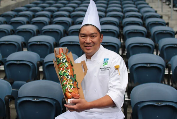 Portrait of CenturyLink Field Executive Chef Seis Kamimura with the new 24-inch-long Colossal Hawk Dog for Seahawks games.
